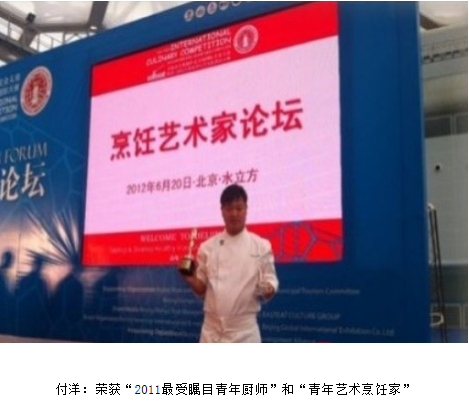 [摘要] 在首屆北京奧林匹克公園國際美食大賽暨第留屆東方美食烹飪藝術家國際大賽,第一場個人賽中,付洋勇奪第一名。在烹飪藝術家論壇頒獎典禮上,付洋榮獲“2011年最受矚目青年廚師”和“青年藝術烹飪家”兩項大獎。付洋:榮獲“2011最受矚目青年廚師”和“青年藝術烹飪家”