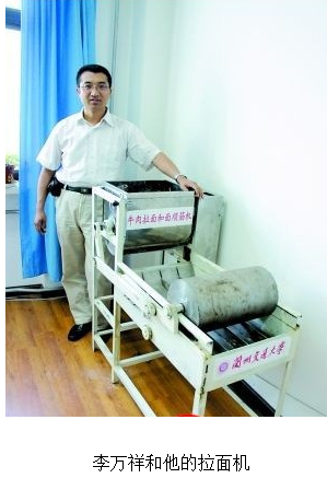 這種拉面機長1.8米,高1.5米,寬80厘米,一般拉面店都能放得下。1.5千瓦的拉面機20分鐘就能完成50斤面的全部和面、揉面、甩面、順筋、拉面工序。在李萬祥的辦公室,記者看到,從機器出口處倒入水和面粉,出口處便可得到成型的面棒,甚至面條。如果用人工,一個人需8小時才能完成這些工序。“不過我現在并不想直接生產出來拉面的面條,主要怕老百姓一時接受不了。”