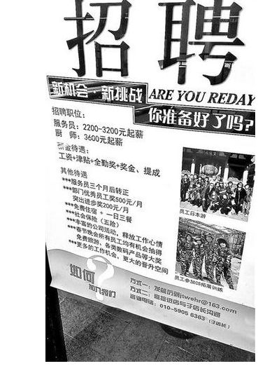 [摘要] 招工方甚至?xí)嘤谇舐毞剑欢窜囆小⒉蛷d則充分利用起自家的門臉,貼出告示公開招聘相應(yīng)人員,一邊緊巴巴地做生意,一邊眼巴巴等著有人上門來應(yīng)聘,有些餐館甚至為招聘打出境外游獎勵。