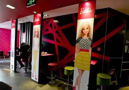 麥當勞在北京、廣州、青島、重慶開了多家芭比主題餐廳。店內各個角度都設有高挑靚麗的芭比人形展板,椅背、墻面也被加上芭比元素,還有放滿整個櫥窗的迷你芭比娃娃系列,甚至連店員的服裝也是粉色。