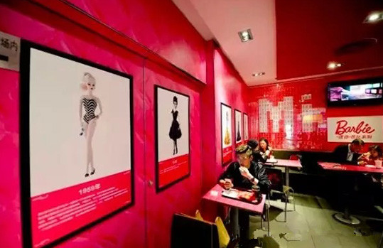 眼下其就在北京、廣州、青島、重慶開了多家芭比主題餐廳。店內各個角度都設有高挑靚麗的芭比人形展板,椅背、墻面也被加上芭比元素,還有放滿整個櫥窗的迷你芭比娃娃系列,甚至連店員的服裝也是粉色...